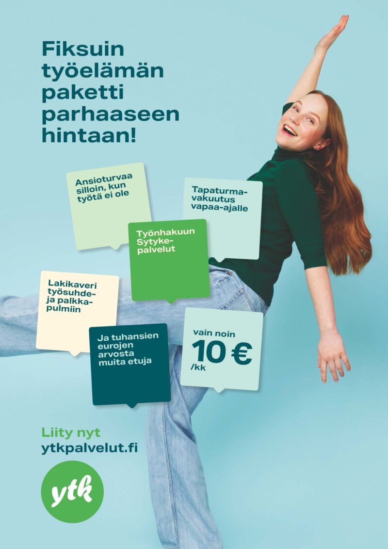 YTK Työttömyyskassa on avoin kaikkien alojen palkansaajille. Kassan jäsenenä saat taloudellista turvaa työttömyyden varalta. Ansioturvan päälle voit valita myös YTK Työelämän kattavat työelämäpalvelut ja saat laajempaa turvaa omaan työelämääsi. Jos olet vielä opiskelija ja työelämäsi alkutaipaleella, voit liittyä edullisesti opiskelijajäseneksi ja hyödyntää kaikkia työelämäpalveluita ilman kassajäsenyyttä.